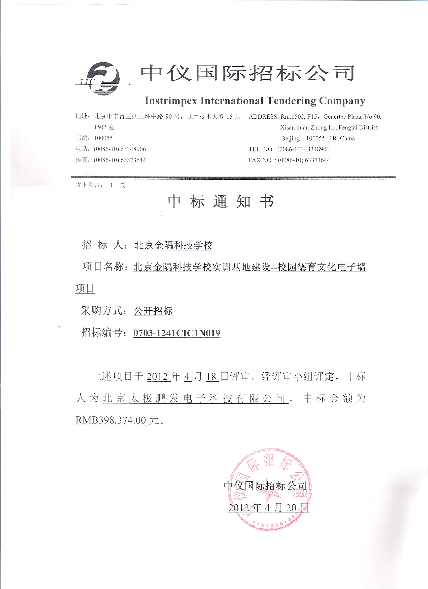 北京太極鵬發(fā)電子科技有限公司中標(biāo)北京金隅科技學(xué)校LED顯示屏項(xiàng)目。產(chǎn)品規(guī)格為:室外P10雙基色顯示屏,面積約為46.32㎡。